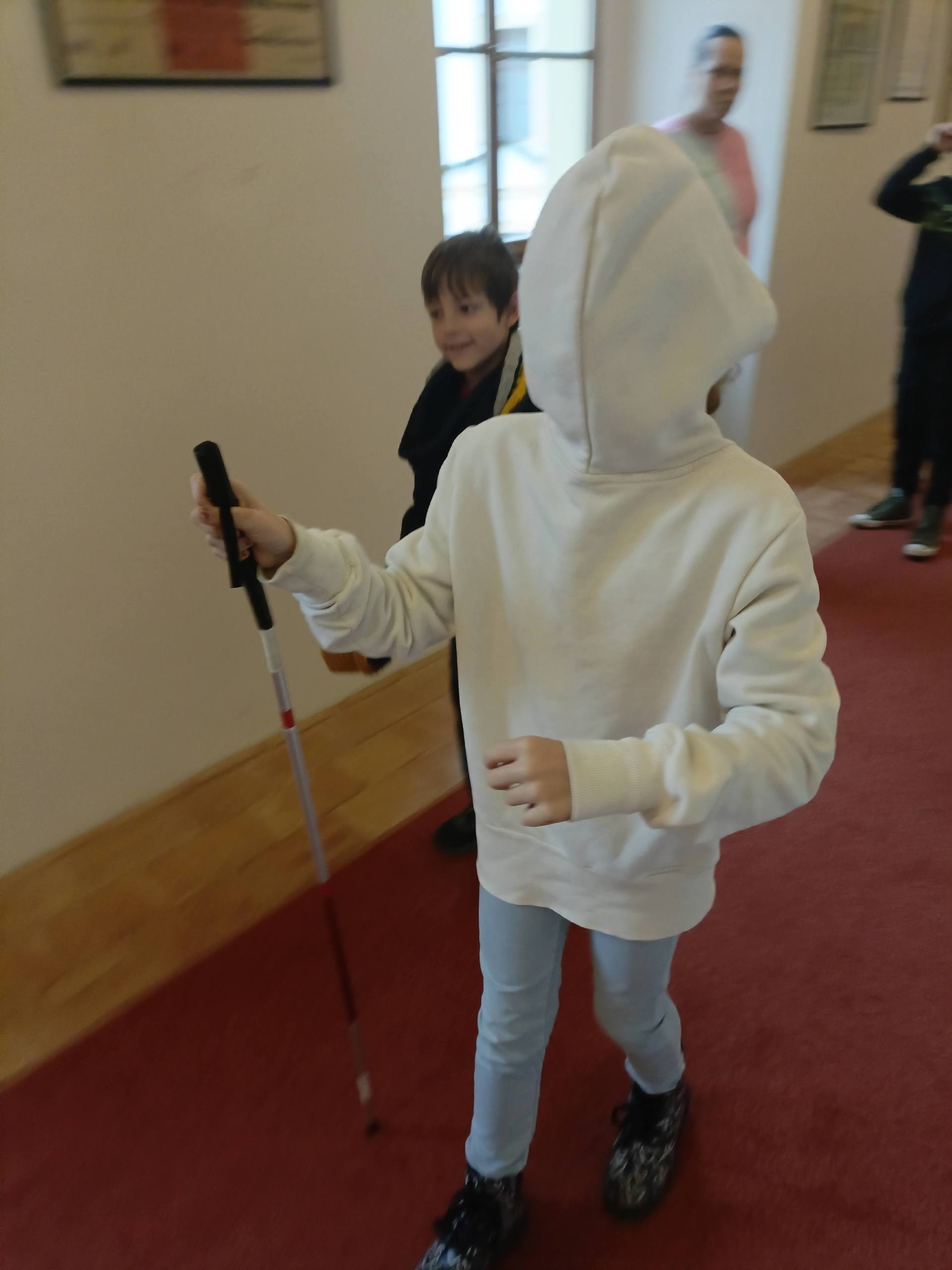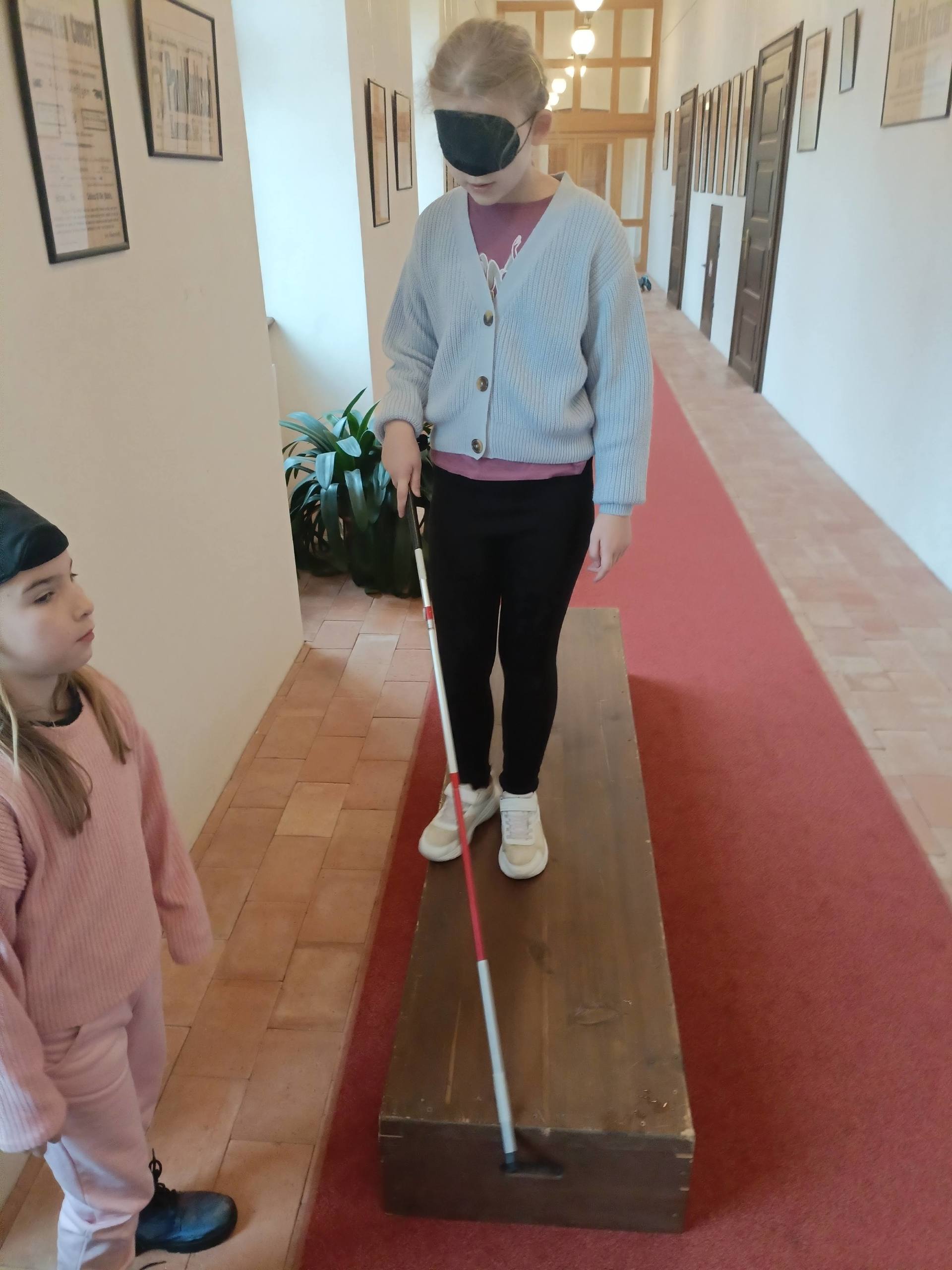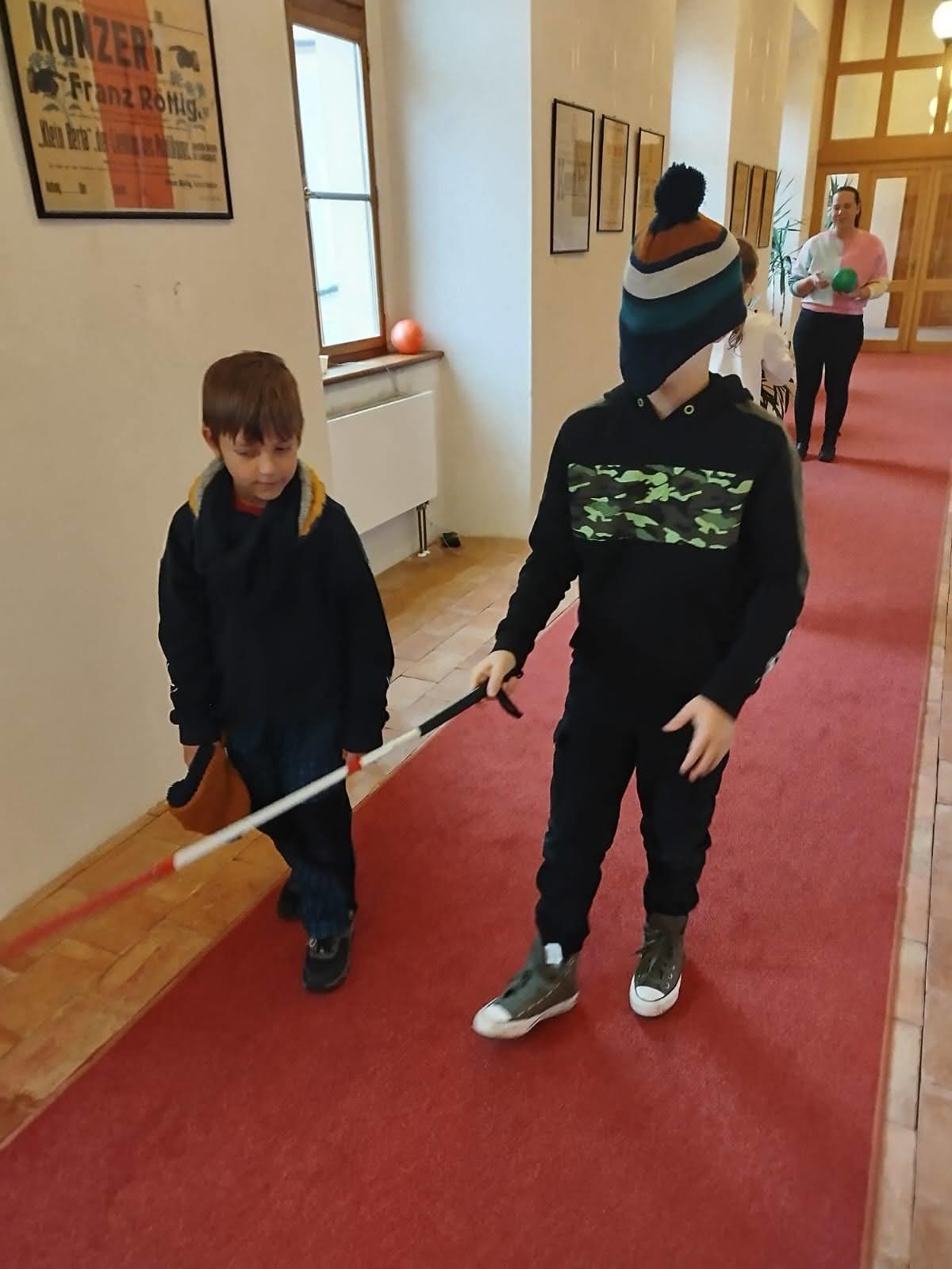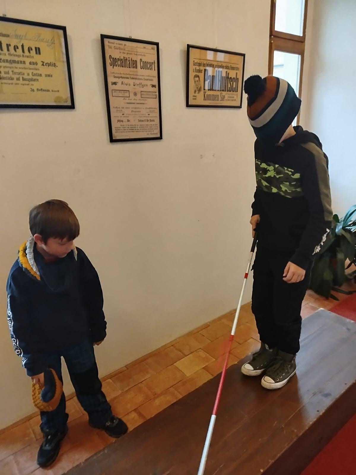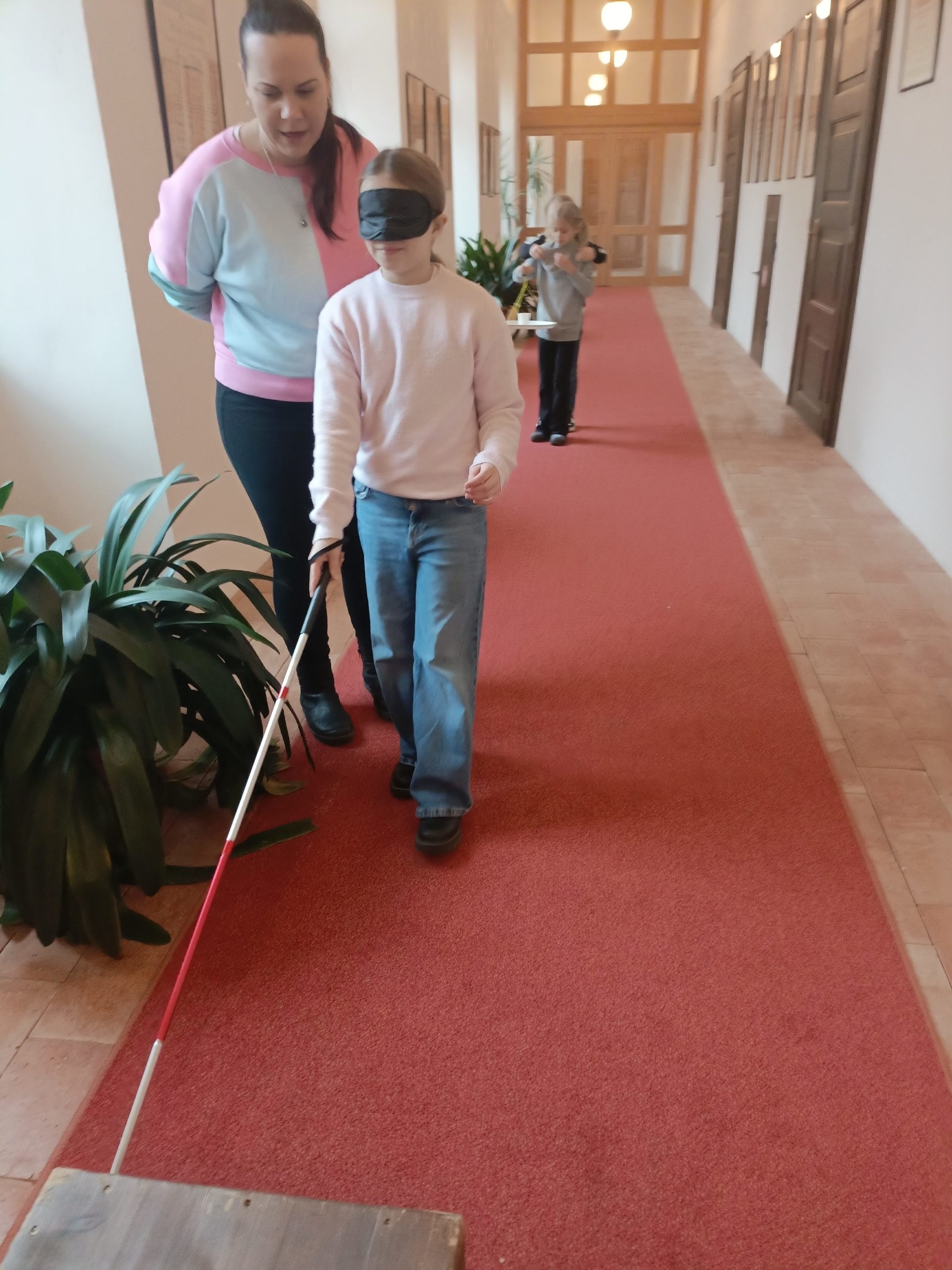 Děti si mohly osahat různé předměty z různých materiálů a poznávat jejich vlastnosti jinak než zrakem. Velkým zážitkem byla část programu, kdy si všichni vyzkoušeli chůzi se slepeckou holí a zjistili, jak důležité je soustředit se na ostatní smysly a spoléhat na pomoc kamaráda.
