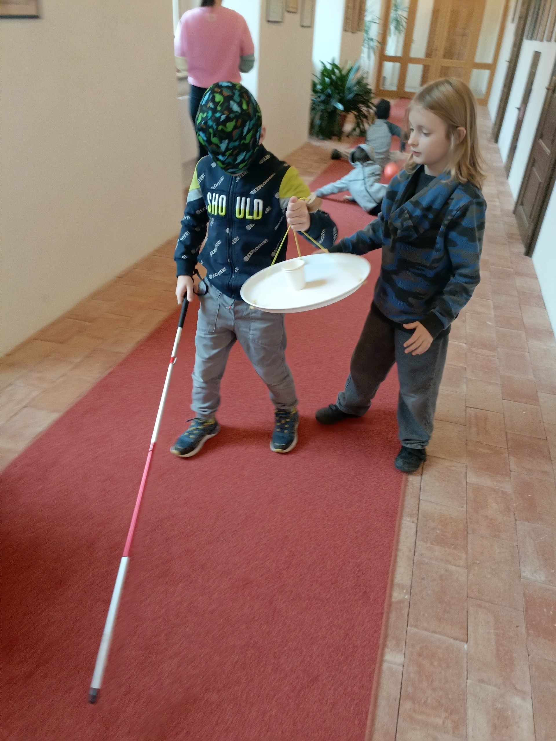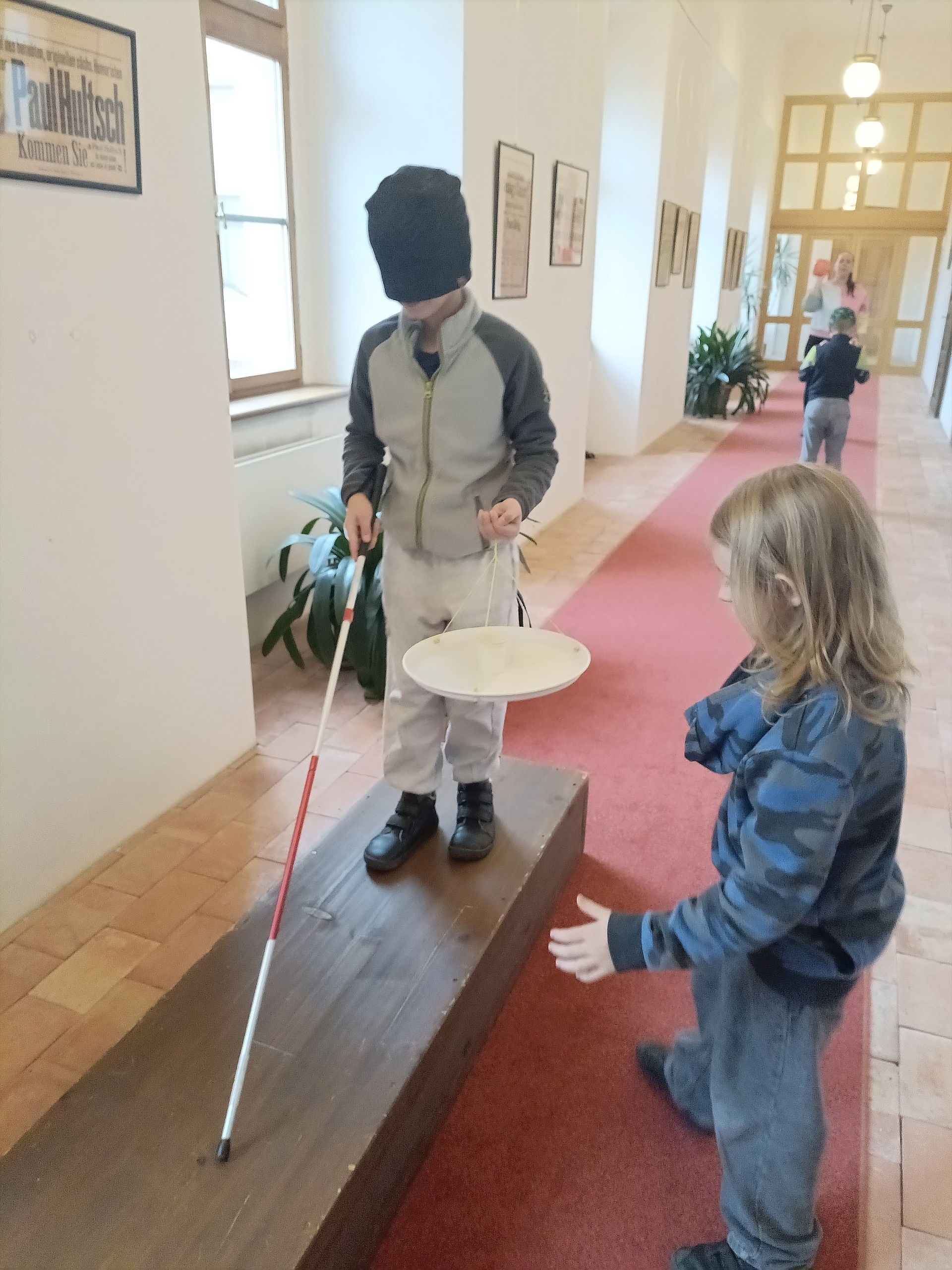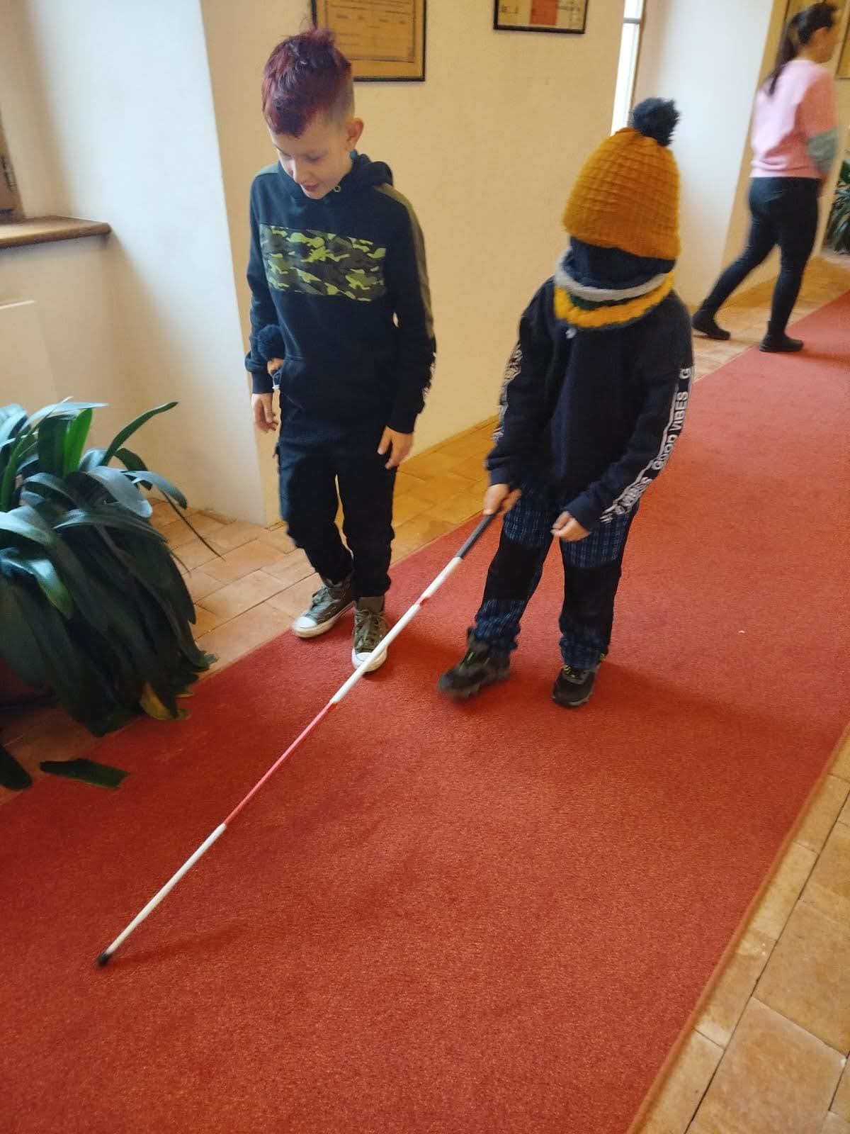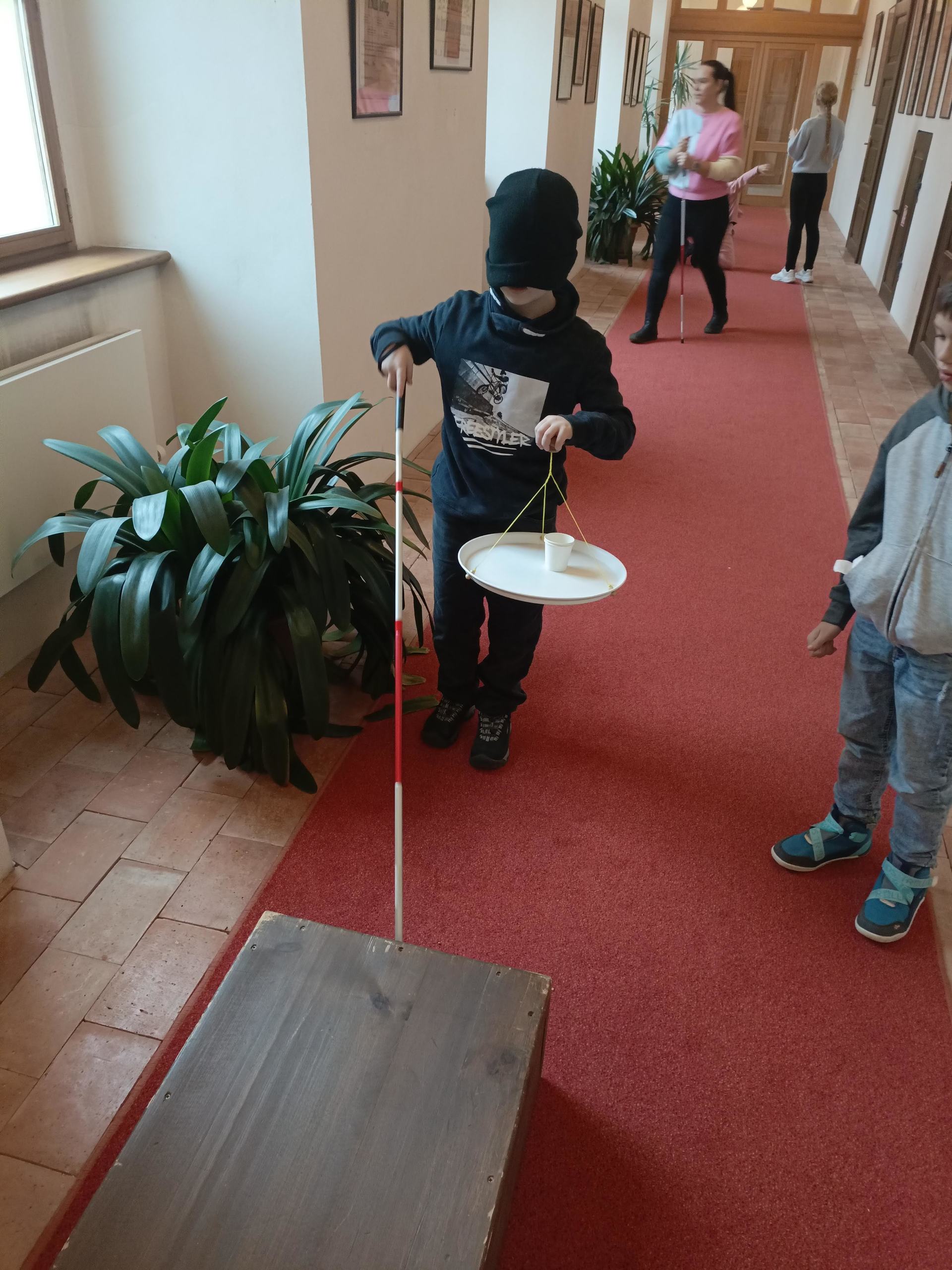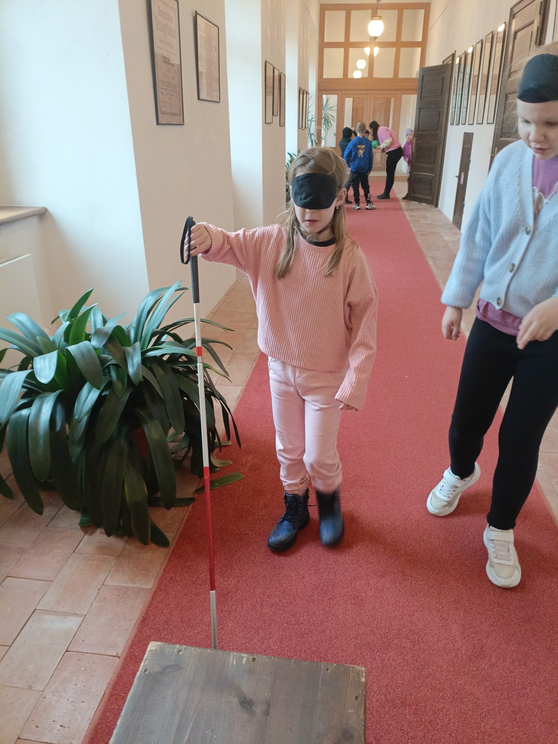 Děti si mohly osahat různé předměty z různých materiálů a poznávat jejich vlastnosti jinak než zrakem. Velkým zážitkem byla část programu, kdy si všichni vyzkoušeli chůzi se slepeckou holí a zjistili, jak důležité je soustředit se na ostatní smysly a spoléhat na pomoc kamaráda.
